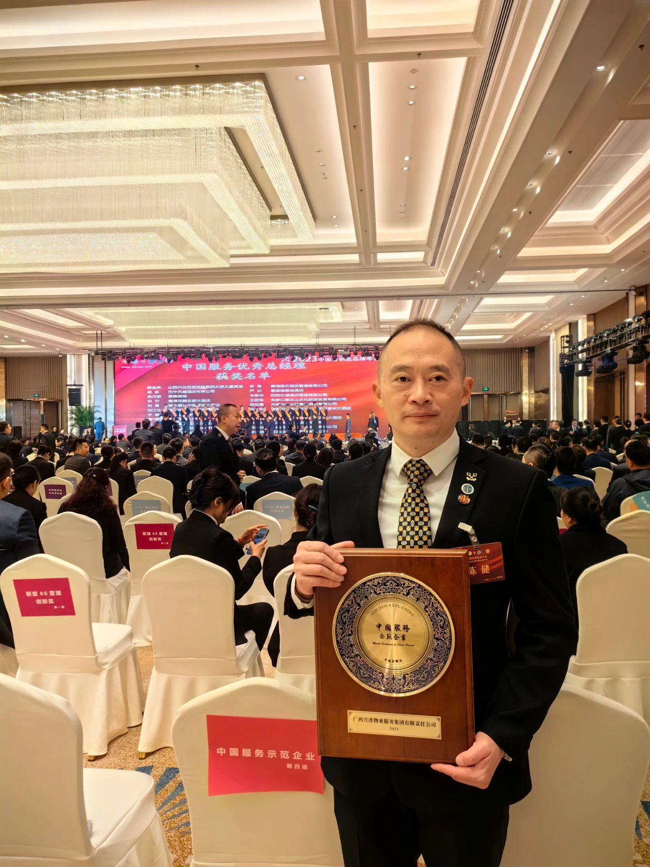 興進服務集團人力行政總監陳健先生(右)與中國金鑰匙主席孫東先生(左)現場合影 經金鑰匙聯盟成員企業申報及聯盟總部綜合評定,興進服務集團憑借高品質、高標準的物業服務,榮獲2023年度金鑰匙國際聯盟"中國服務示范企業",集團總經理王永忠先生獲"優秀總經理"稱號,興進漓江郡府、漓江壹號獲"優秀服務團隊"榮譽稱號。