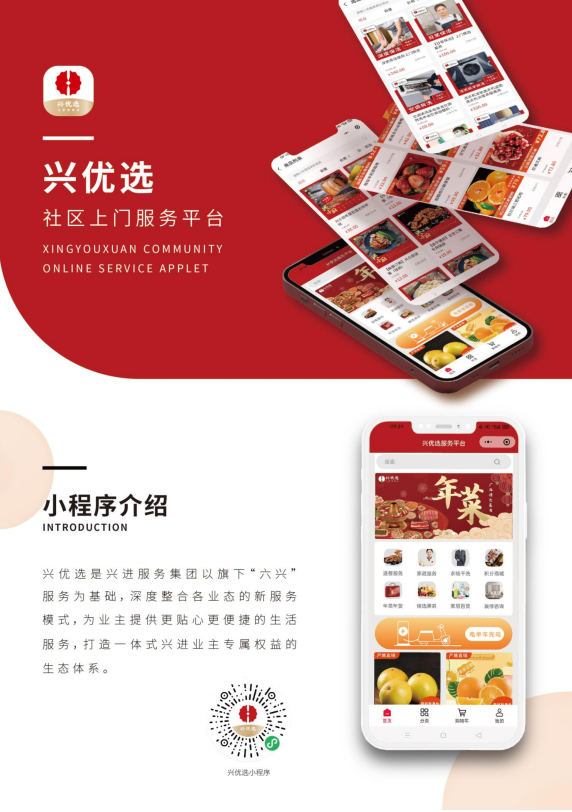 目前興進物業圍繞客戶需求,創建"興優選"線上商城,包含幸福食堂、家政保潔、房屋租售、好物購買等一站式生活服務。貼心便利的全生命周期服務,只為讓您的生活溫馨舒適、便捷多彩,觸手可達。