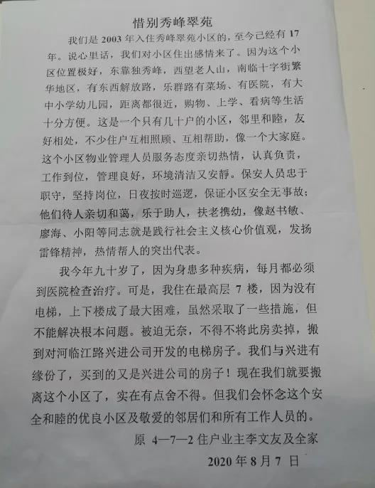 在搬離秀峰翠苑時,他曾寫下惜別秀峰翠苑的一篇文章,對秀峰翠苑的環境、配套、和睦社區、貼心物業贊不絕口。雖然搬離秀峰翠苑,但是老人和興進的緣分還在繼續,新居銀桂府沒有讓老人失望,開篇我們所看到的就是老人對新居銀桂府的一切有感而發和高度贊揚。