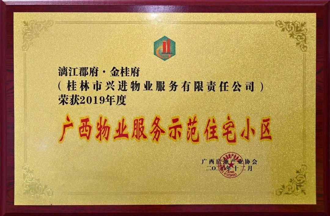 在此次物業管理行業大會上,興進·漓江郡府金桂府、興進·中央尊館喜獲2019年度"廣西物業服務示范住宅小區"榮譽稱號。