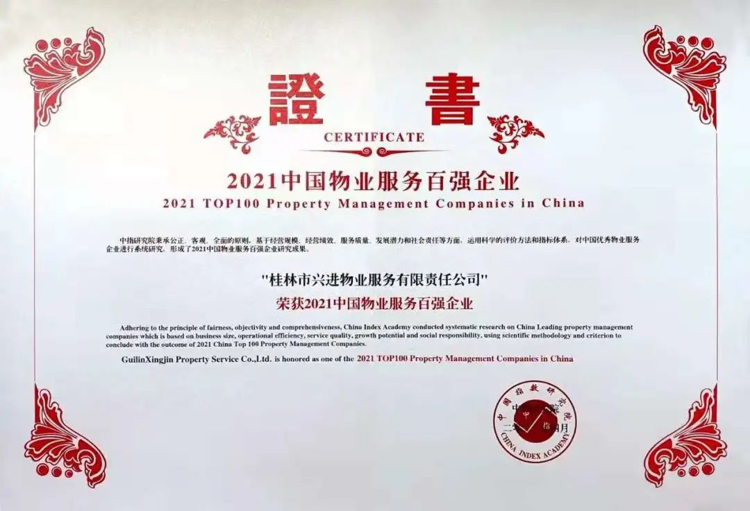 2021年,經中指研究院、中國房地產TOP10研究組研究調查,興進物業榮膺2021年年度中國物業服務百強企業第85位,是桂林市2021年度唯一登榜企業。自2001年成立以來,興進物業憑借一整套與眾不同的管理制度與服務標準,贏得業主的支持與信賴,屢獲業界殊榮。