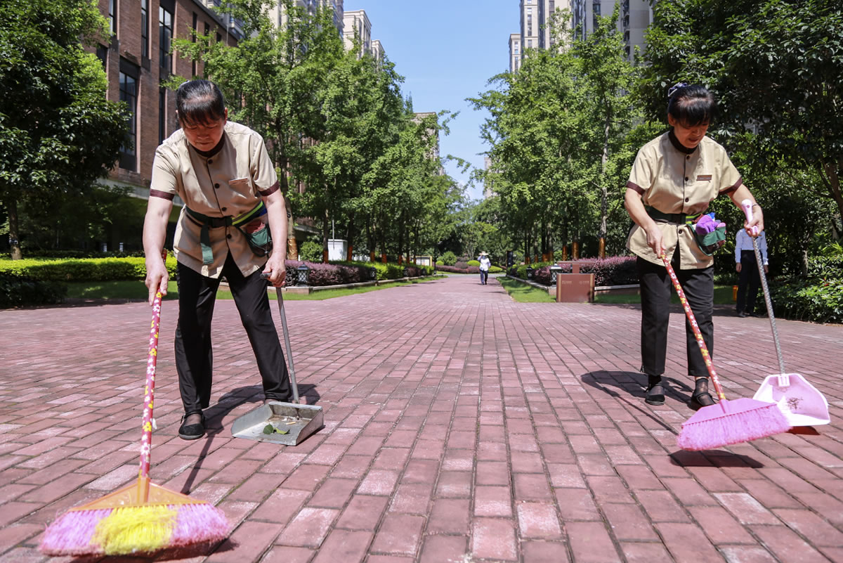 8月1日8點,大居來到興進·漓江壹號小區,看到不少保潔人員已開啟了一天的工作,他們有的打掃道路上的落葉、垃圾,有的清洗單元門前的垃圾桶,有的在擦拭入戶單元大門和電梯轎廂……
