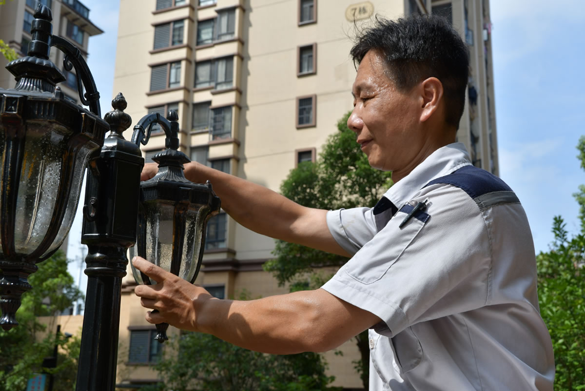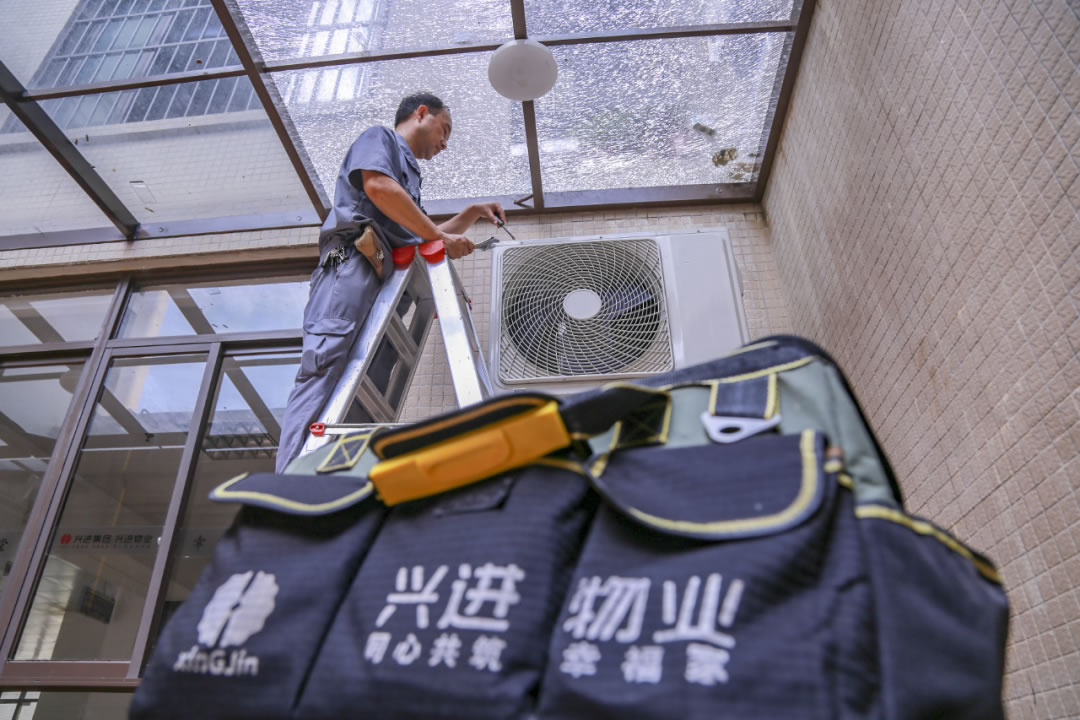 在熾熱的瀝青路面上、在悶熱的樓梯間里、在狹小的電梯管井內,小區內隨處可見興進物業人揮汗如雨的身影。