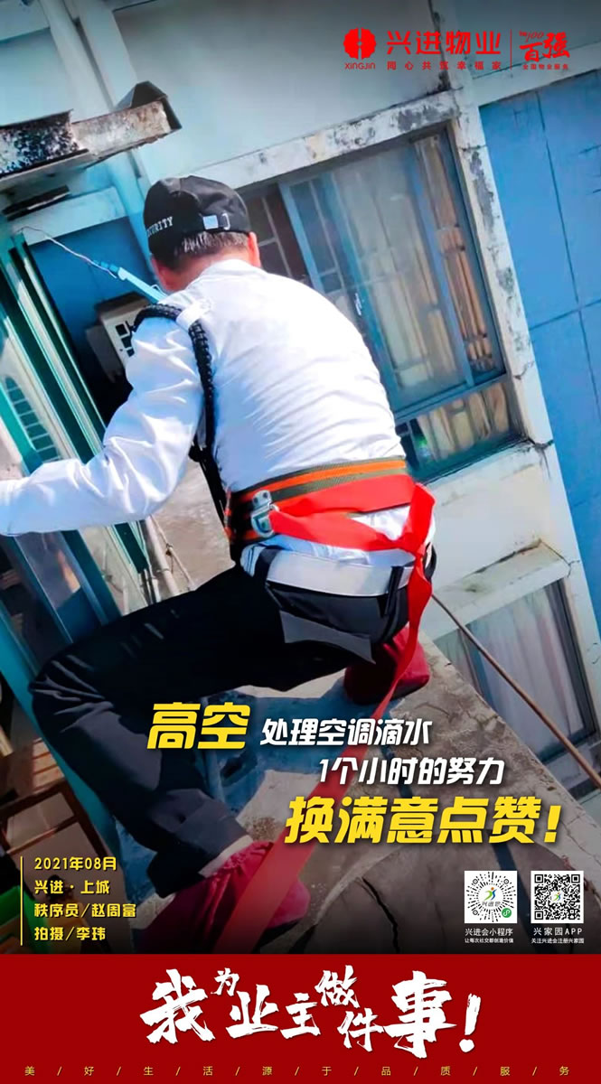 興進·上城物業秩序班長李瑋與隊員趙周富,頂著一個多小時的烈日,汗流浹背地幫助業主更換空調冷凝排水管;