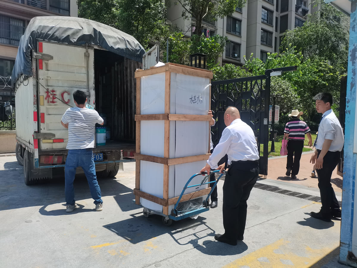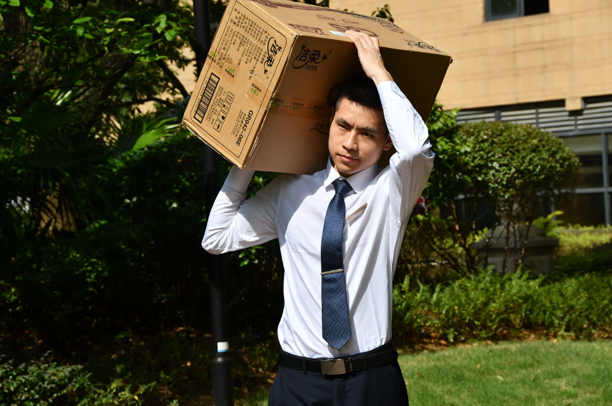 興進·上譽物業秩序班長穆華坤和隊員張學、秦串林在正午炙熱的太陽下,幫助業主搬運重達60公斤的冰箱至頂層閣樓……