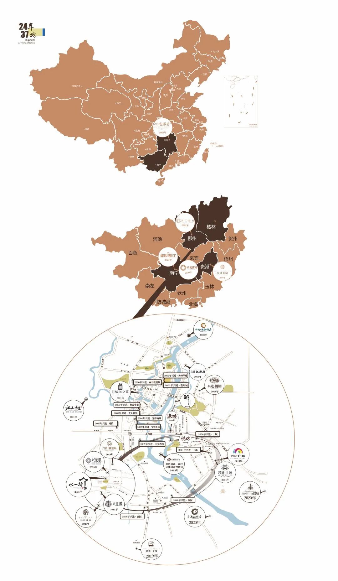 24載匠筑37城,助力城市更新的同時,興進(jìn)集團(tuán)竭盡所能為人居生活增添更多可能。如今平均每15個桂林人中就有1位興進(jìn)業(yè)主,南寧、柳州、貴港、長沙等地都有他的足跡。