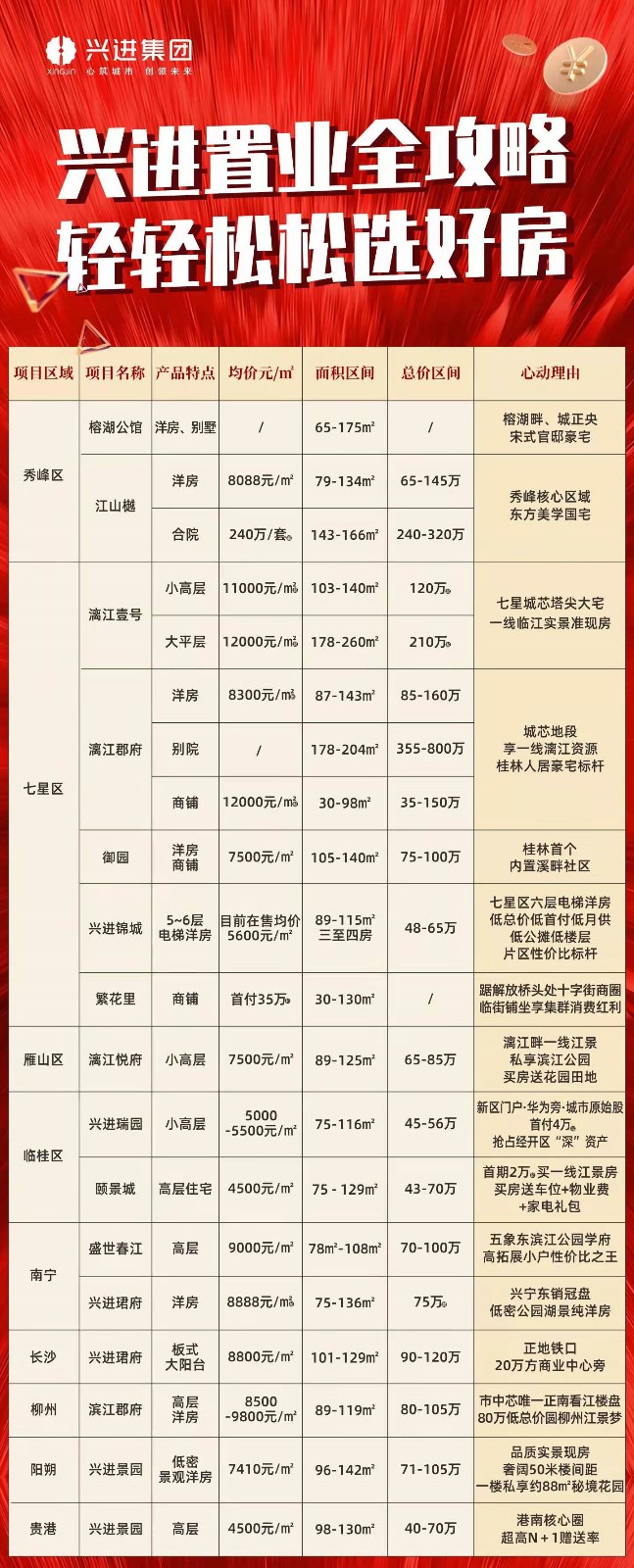 作為深耕桂林24年的本土房企,興進集團熟悉桂林人的居住喜好,憑借全國一級開發資質的實力,堅持走精品路線,并以全國百強物業的貼心服務,打造出許多桂林有口皆碑的高端項目。