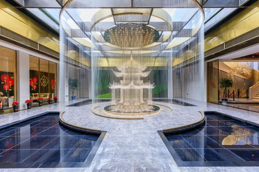 江山樾主打新中式風格,以金色為主基調,采用了王府的規制,將廡殿頂作為屋頂結構,并大量使用云紋、回形紋、山形紋等中式符號。