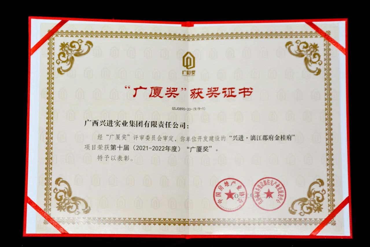興進集團憑借穩(wěn)健經(jīng)營和市場的高度認可,榮獲廣西地產(chǎn)穩(wěn)健發(fā)展企業(yè)大獎,同時入圍"2022年廣西房地產(chǎn)本土房企權益銷售金額"TOP20榜單,位列第三;興進·漓江郡府榮獲"2022年廣西地產(chǎn)各市縣標桿項目"獎項。